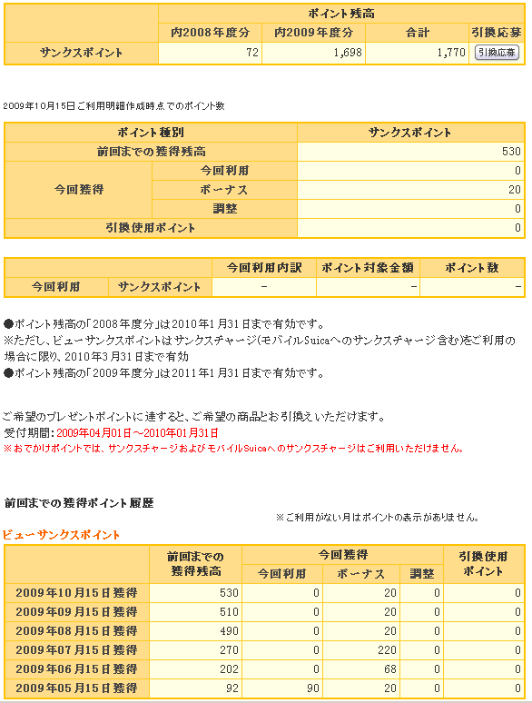 いつもYahoo! JAPANをご利用くださいまして、誠にありがとうございます。 「ボーナスポイントキャンペーン<9月度>」(実施期間:2009年9月9日) へのご参加、誠にありがとうございました。 上記キャンペーンで獲得されたYahoo!ポイントを2009年11月5日に進呈させて いただきましたので、お知らせします。本キャンペーンで進呈させていただい たポイントは、有効期限が11月30日までのポイントです。 ┏━━━━━━━━━━━━━━━━━━━━━━━━┓ ┃ *******様 ┃ ┃┌∞┐ ┃├┼┤ Yahoo!ポイントを進呈させていただきました! ┃└┴┘ ※有効期限:2009年11月30日まで ┃ ┗━━━━━━━━━━━━━━━━━━━━━━━━┛ 期間限定ポイントなので11月中にSuicaポイントへ移行しようと思います. ブログランキングに登録しましたので プチッとクリック↓してやってくださいませm(_ _)m |