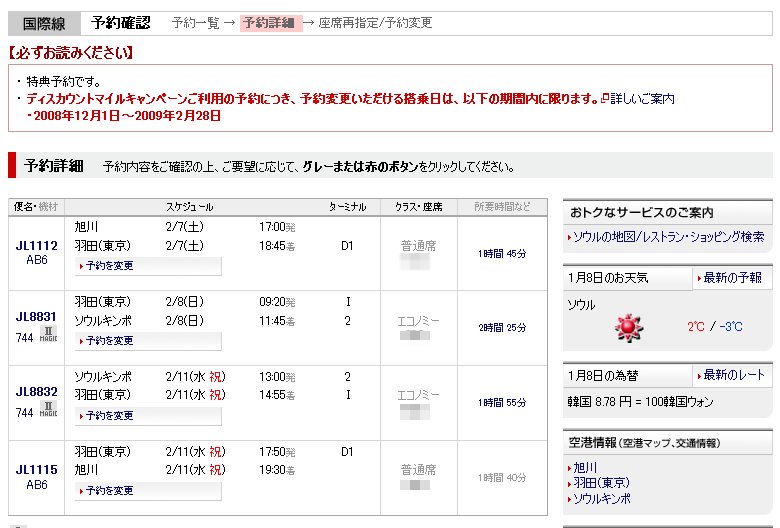 JAL 日本航空 昨晩に特典航空券の予約を完了しました. 日程は以下のように東京で前泊し, 韓国・ソウルでは3泊4日の予定 になっています. 韓国への特典旅行には12000マイレージと 燃油付加特別料金と空港使用料として約1万円かかりました. これで,JMBのマイレージ残高は1万マイルを下回っていますが 1月中にインターネットの各サイトからマイレージに移行するので 2月には5万マイル程度のマイレージ残高になると思います. 今のウォン安を考えれば,この時期の韓国旅行は お得度が高いように思いますw ![]() ブログランキングに登録しましたので プチッとクリック↓してやってくださいませm(_ _)m |