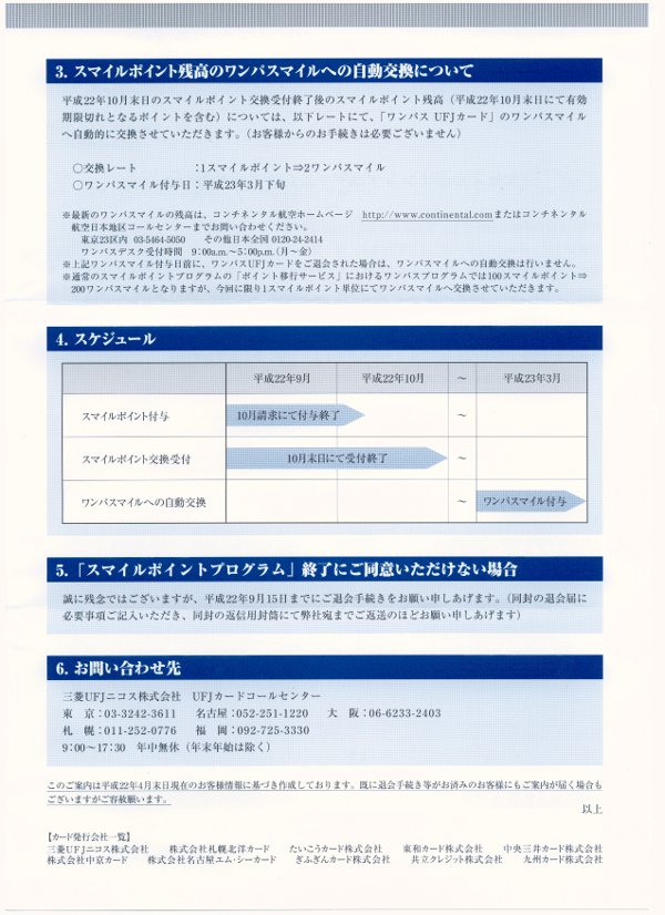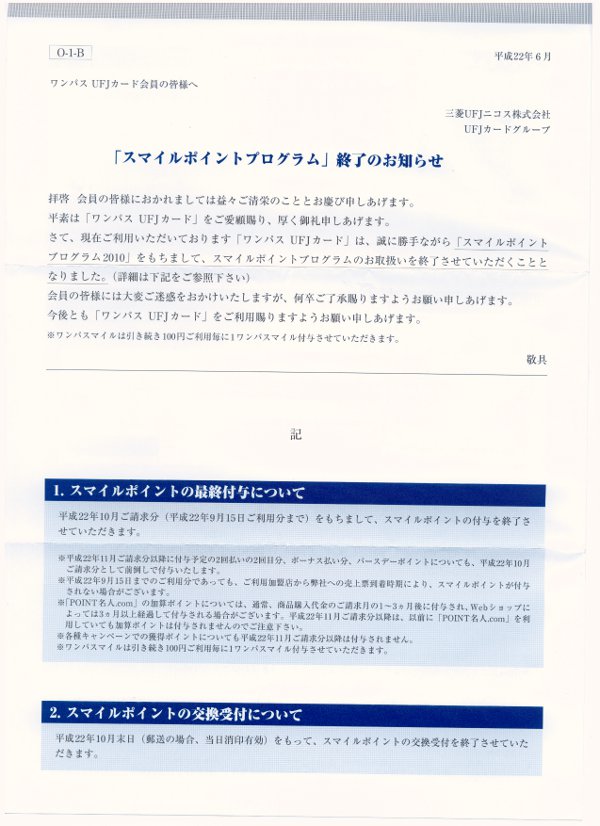 ワンパスUFJカードに対するスマイルポイントの付与が2010プログラムをもって 終了する旨が通知されました. ワンパスUFJカードは,コンチネンタル航空ワンパスのマイレージが貯まるクレジットカードですが UFJカードのポイントプログラムでもあるスマイルポイントも同時に貯まるというお得なカードでした. 例えば,カードを1000円利用すると 100円あたり1マイルでの合計10マイルに加えて 1000円あたり1ポイントのスマイルポイント が溜まっていました. スマイルポイントは1ポイント2マイルに換算できるので, 1000円の利用で実質的に12ワンパスマイルが貯まる仕組みで 年間を通して利用するとかなりのお得感がありました. 今回のポイントプログラム改悪は,カード会社主導によるものか ユナイテッド航空と合併予定のコンチネンタル航空主導によるものか エンドユーザには知る由もありませんが ポイントまたはマイルが溜まりにくくなるというのは残念なことでなりません. もっとも,コンネンタル航空ワンパスに関してはダブルマイル登録しているので 来年まで100円=2マイルという高還元が保証(年間最高100万円利用分まで) されているので,今後とも積極的に利用する予定のクレジットカードではあります. 今回のスマイルポイント付与の終了に関する案内の詳細は,以下のとおりとなっていました. 9月15日までの利用分には,2回払い,ボーナス払いなどを含めて,スマイルポイントが付与されます. ブログランキングに登録しましたので プチッとクリック↓してやってくださいませm(_ _)m |