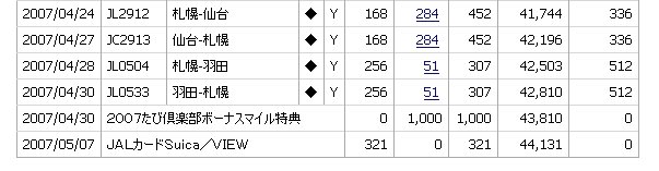 新千歳(CTS/SPK)-仙台(SDJ)-新千歳(CTS/SPK) 新千歳(CTS/SPK)-羽田(HND/TYO)-新千歳(CTS/SPK) のフライトマイルと 2007たび倶楽部ボーナスマイル特典および マイルが積算されました. 年度別のJALマイレージの状況は以下のようになっています. もう少しで今年度のJALマイレージも10000マイルを超えます(^^) そしてトータルでも45000マイルを超えます. 人気blogランキングに登録しましたので プチッとクリック↓してやってくださいませm(_ _)m |