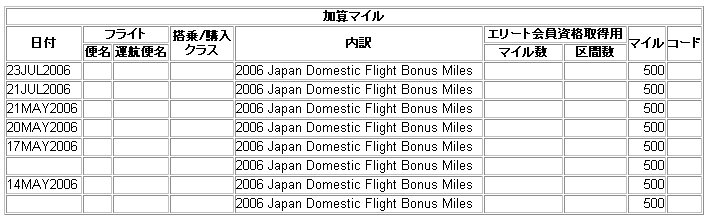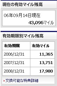 今日(2006年9月14日)現在のJMB残高はJALカードの利用によるマイルも含めて以下のようになっています.JALカードによるマイルの蓄積が効果あるように思います.