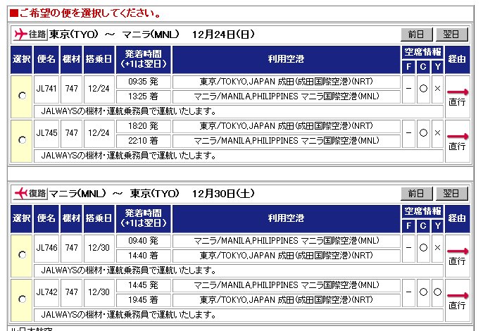 年末で有効期限切れになるJALマイルが1万マイル以上あるので,JALマイレージを使って年末にマニラに行こうかと考えた.
