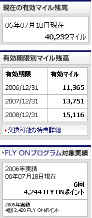 ノースウェスト航空のマイレージプログラムであるワールドパークスでは,数年前から“ニッポン500マイル・キャンペーン”を実施している.これはJALやANA等の国内線全線の搭乗券半券ごとにワールドパークス500マイルを加算するというキャンペーンだ(キャンペーン事務局に搭乗券半券を送付する).ノースウェスト航空が参加している航空連合のスカイチームに参加している日本の航空会社がないための苦肉のマイレージ加算方法ではあるのだが,1フライトで500マイル貰えるというのはかなり効率がよい.さらに,JALやANAのマイルプログラムでマイレージを獲得していても獲得出来るのが◎だ.ということで,5月の旭川-東京-福岡の往復で4回フライトし,その直後に旭川-東京の往復があったので500×6=3000マイルが加算されてました.年間最大10フライト分の5000マイルまで加算されるので,あと4回分は加算されることになります.本日現在のワールドパークスマイルは22,927マイルになっています.